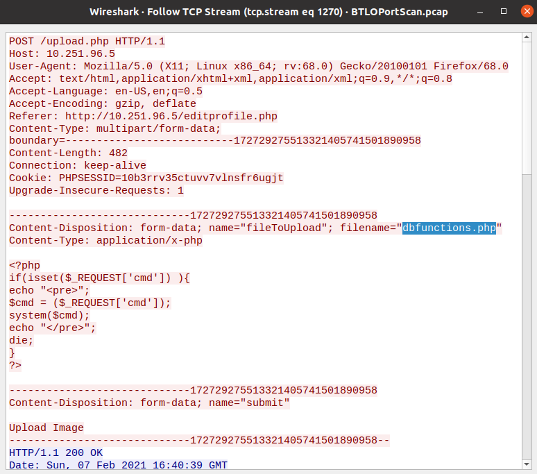 Following the TCP Stream we can see clearly the POST Request and the filename of the webshell.